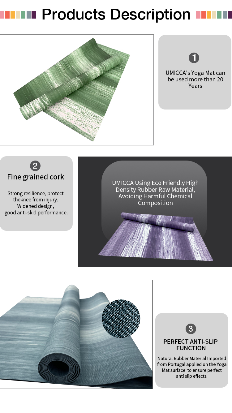 Work with UMICCA factory and Star your Yoga mat business. Low MOQ and best price. We can custom yoga mats to meet your demand.